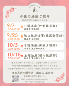 2025年9月~10月の、上宮寺の法座をお知らせします。 日程 講師 9/23(火) 13:00~ 秋のお彼岸法要 桑原 悠真 氏 (山口県 龍巖寺) 10/5(日) 10:30~ 第1日曜_常例法座 南條了瑛 氏 (東 […]